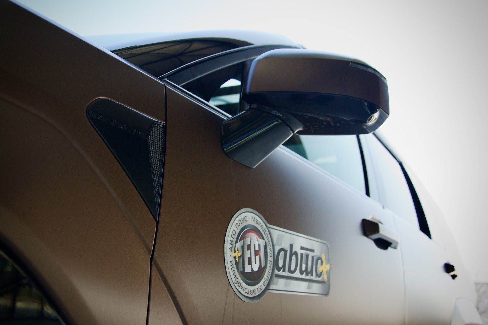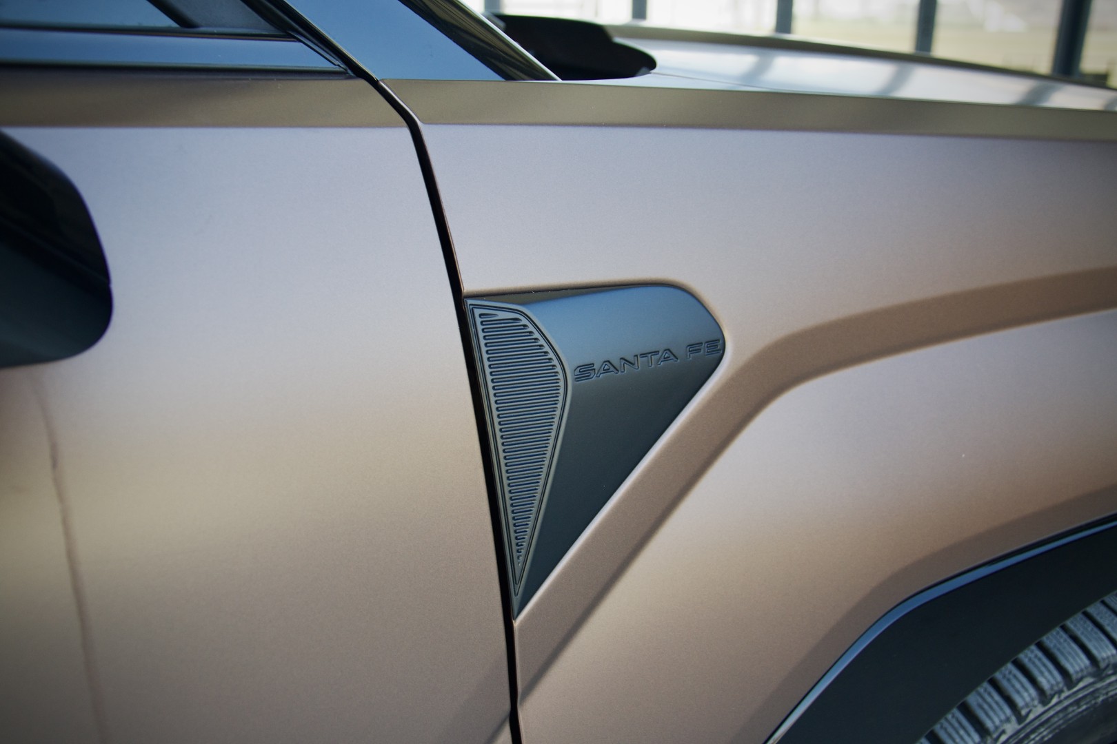 Со должина од 4.830 мм, 1.900 мм ширина и 1.770 мм висина, Santa Fe создава монолитно присуство каде и да го паркирате. Предната маска е централната точка на целото возило. Параметрискиот потпис со мотив на буквата „H“ е прецизно врежан во светлосните склопови со што го дефинираат лицето на автомобилот кое одава впечаток на строга интелигенција. Решетката за ладење на агрегатот делува скоро скулпторски изведена со што го дава својот придонес за цврстата целина на предниот дел. Страничниот профил ја открива праволиниската пропорционалност која владее со дизајнот преку изведбата на стаклените површини и масивните B и C столбови, додека нагласените, доплнително поставени прагови, во нашиов случај визуелно го спуштаат центарот на гравитација. Црните лесно метални бандажи облечени во гуми со димензии од 255/45R20 ги испополнуваат масивните отвори и допринесуваат со својата геометрија во профилната слика.